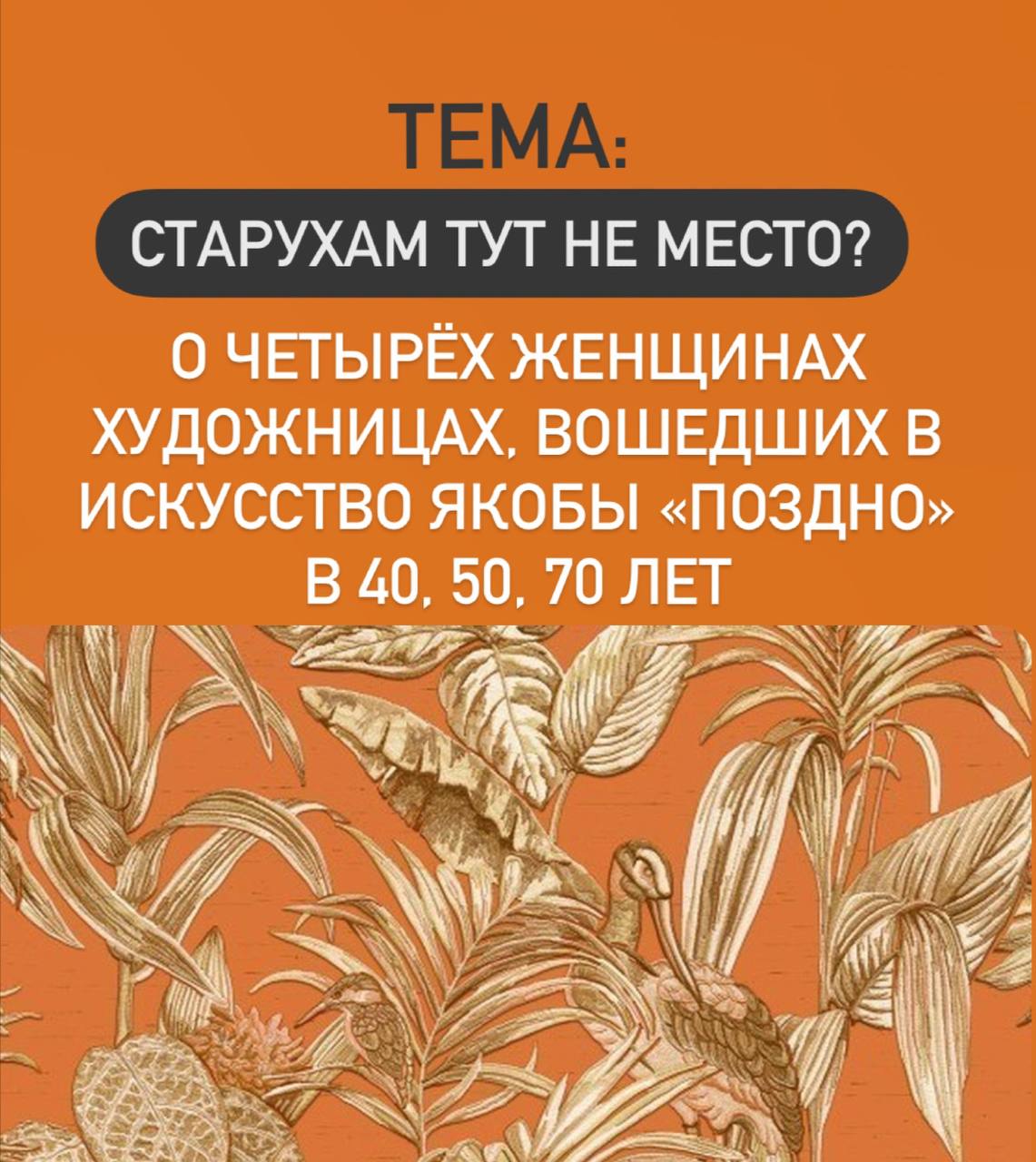 Поток посвящен женщинам-художницам, которые вошли в искусство якобы «поздно» в 40, 50, 70 лет, интереснейшим образом проявили свой талант и были признаны Арт сообществом: Катя Медведева, Джулия Камерон, Бабушка Мозес, Маруся Примаченко. 4 лекции, 4 зачета, 4 домашки
