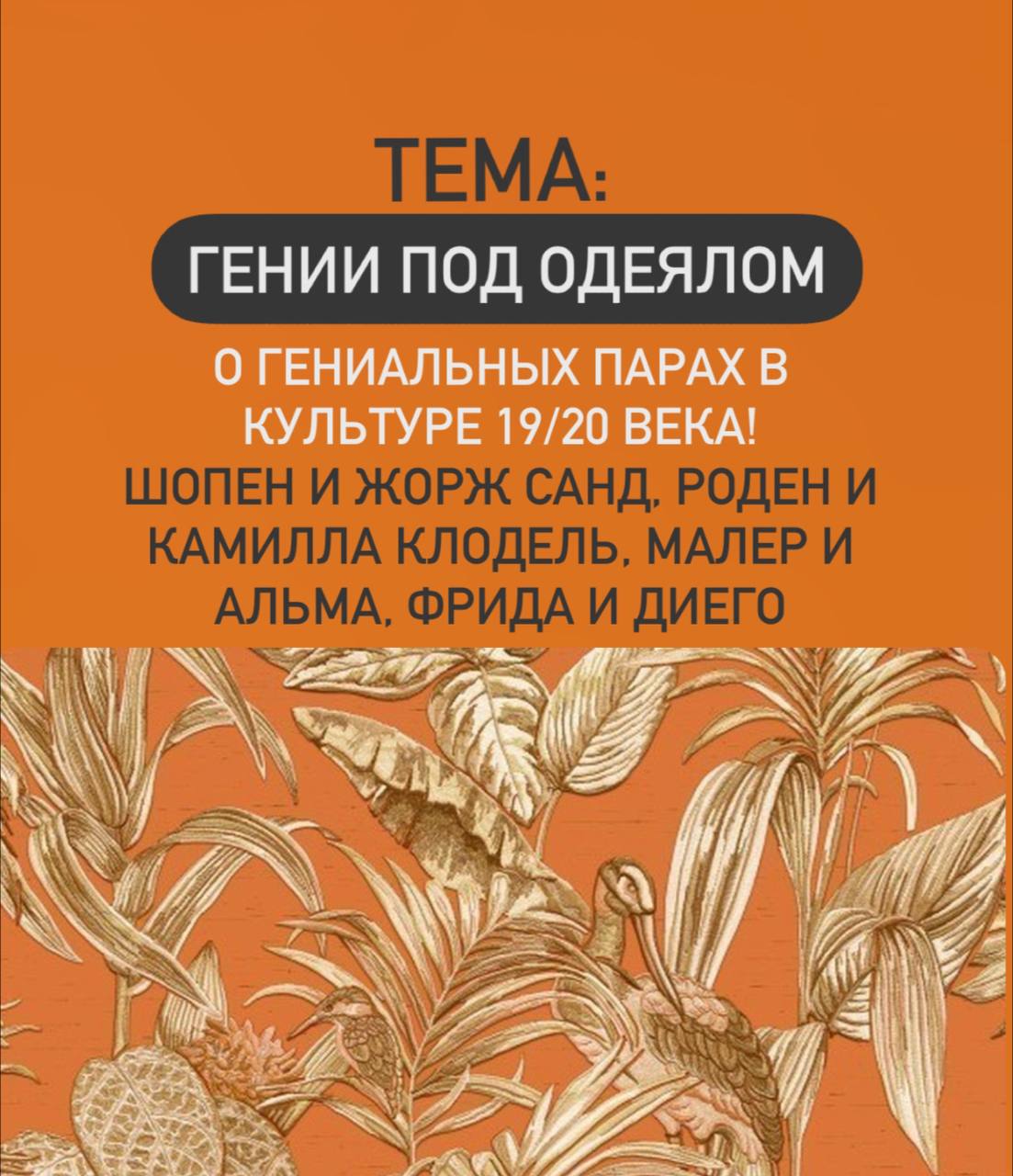 О гениальных парах в истории культуры 19/20 века: Шопен и Жорж Санд, Роден и Камилла Клодель, Фрида Кало и Диего Ривера, Малер и Альма Малер. 4 лекции, 4 зачета, 4 домашки